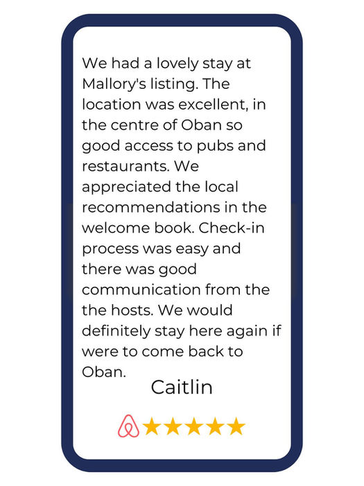 We’re thrilled to welcome you to our bright and cosy apartment in Oban! We hope your stay is everything you need it to be, offering a perfect blend of comfort and relaxation. If you need anything at all, don’t hesitate to reach out—we’re always happy to help!Sincerely,