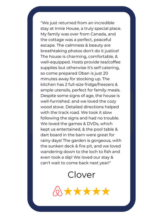 We’re so excited to welcome you to Innie House! Whether you’re here to explore the outdoors or just relax, we hope you’ll love the peace and beauty of Loch Tralaig as much as we do. If you need anything during your stay, please feel free to reach out anytime.Sincerely,